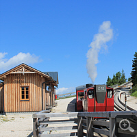 In Sankt Wolfgang besteigen wir die Zahnradbahn. Ruckelnd fährt diese an und schnaubt dann langsam den Berg empor. Bei langsamer Fahrt entdecken wir bereits die ersten Exemplare von Dactylorhiza fuchsii an den Hängen entlang der Bahnstrecke. Wir steigen als einzige Touristen an der Mittelstation aus. Die restlichen Touristen bevorzugen ein Erreichen der Gipfelstation ohne körperliche Betätigung.